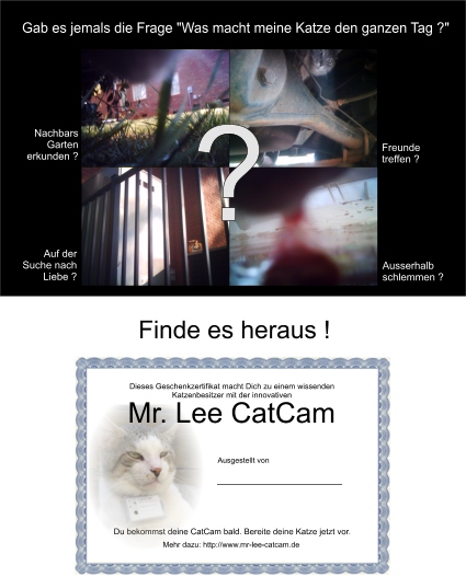 A gift certificate in case that the CatCam can not be delivered in time. You can download the high resolution PDF file, print it out, fold it in the middle and give it as a present. We can also ship a gift certificate to the one you buy a CatCam for. Please contact us for details.