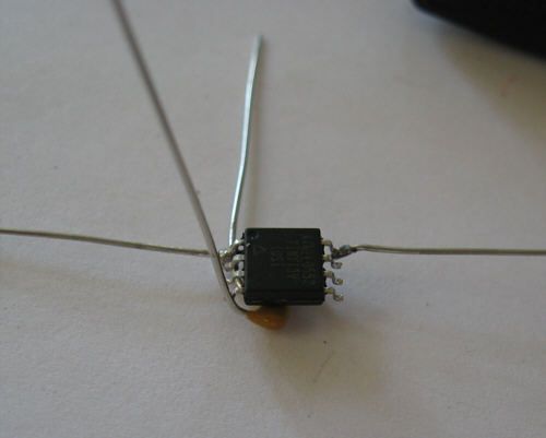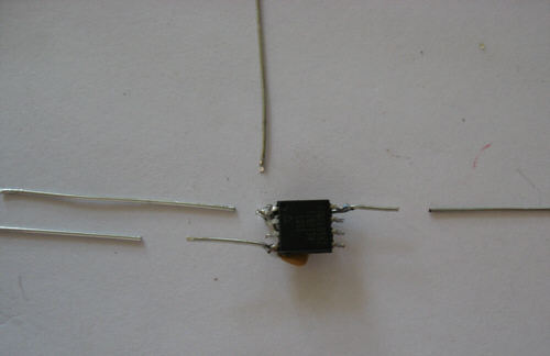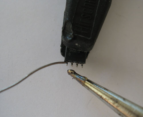 Step 12 - A piece of wire is placed on the chip surface to connect both upside bended pins. Solder wire to pins. It is best to hold wire during soldering because the speed of heat distribution will unsolder the second solder point.