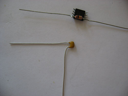 Step 5 - Bend now one wire of the capacitor in a right angel to the outside.