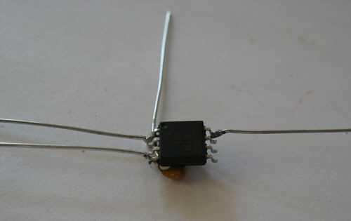 Step 2 - The chip is flipped upside down and the 10k resistor is placed across the surface. Then it is soldered to one pin. The marking for pin 1 is below the lower left corner of the chip (faces to the working surface)