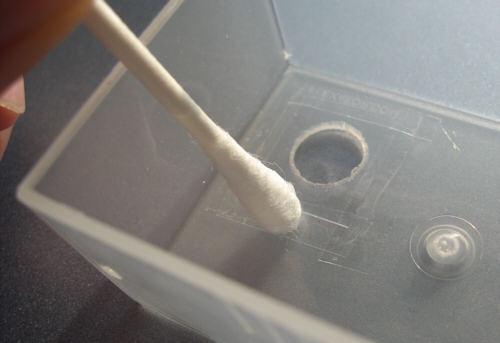 Schritt 5 - Platziere einen Klebebandstreifen auf einer Seite des Sichtfensters, so dass etwa die Hälfte davon überhängt. Dann das Sichtfenster im Gehäuse über der Linsenöffnung platzieren und mit einem Wattestäbchen das Klebeband andrücken. Das Ziel ist das Sichtfenster umlaufend mit Klebeband fest zu machen und zwar so, dass das Klebeband nicht in den Bereich des Loches kommt.
