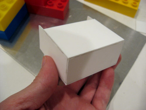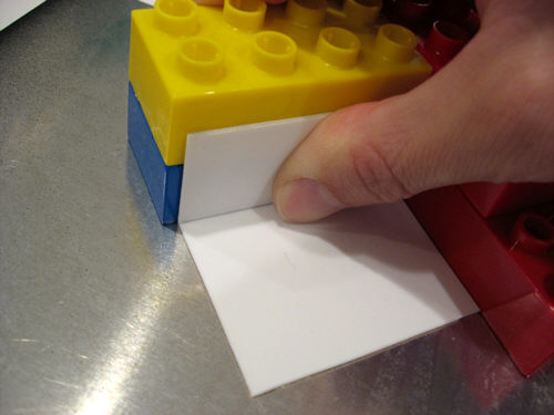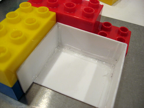 Step 8: Align side walls. Here the reason for the Duplo game will get clear quickly. The base plate in inserted into the Duplo-L, the first side wall is aligned in right angles. Note: if you usually drop and mess with hot glue it is recommended that you cover the desk and the Duplo bricks with flat pressed aluminum foil.