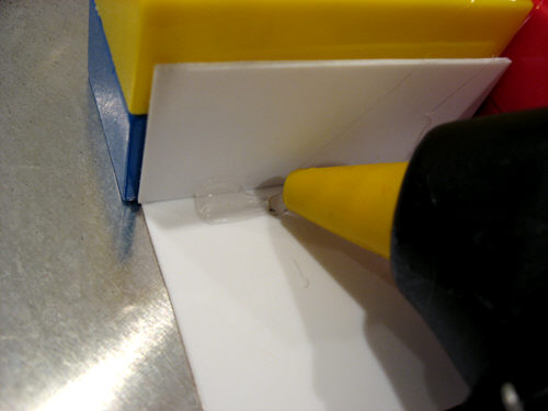 Schritt 9: Seitenteil anpunkten. Mit zweit Tropfen Heisskleber wird die Seitenwand fixiert. Unbedingt warten bis der Heisskleber fest ist bevor man die Seitenwand loslässt.