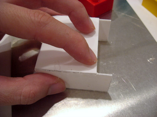 Schritt 8: Seitenteil justieren. Hier wird der Sinn der Spielerei schnell klar. Die Bodenplatte ist im Duplo-L eingelegt, die erste Seitenwand wird 2-fach rechtwinklig dazu ausgerichtet. Hinweis: wer gerne mit Heisskleber kleckert sollte sowohl die Duplosteine als auch die Tischplatte mit glatt gestrichener Alufolie abdecken.