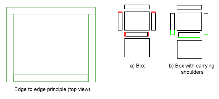 Auf der linken Seite ist dargestellt wie die Seitenwände aneinander stoßen um eine saubere und stabile Kontur zu erreichen. Die Seitenwände stehen auf dem Gehäuseboden (schwarzer Umriss).