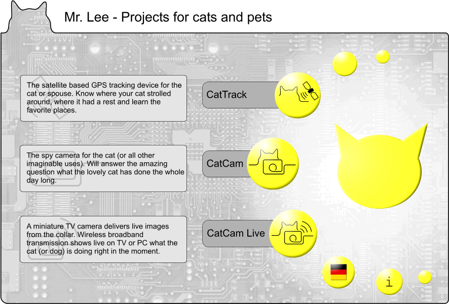 Visual impaired reading help: Mr. Lee - Projects for cats and pets CatCam - The spy camera for the cat (or all other imaginable uses). Will answer the amazing question what the lovely cat has done the whole day long. CatCam Live - A miniature TV camera delivers live images from the collar. Wireless broadband transmission shows live on TV or PC what the cat (or dog) is doing right in the moment. CatTrack - The satellite based GPS tracking device for the cat or spouse. Know where your cat strolled around, where it had a rest and learn the favorite places. |